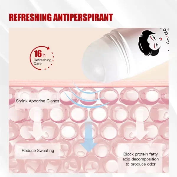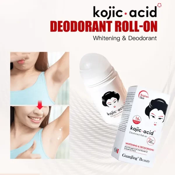 Abtitranspirante roll-on iluminador con ácido kójico de la marca Guanjing Beauty. El producto está diseñado para blanquear y desodorizar, con una fórmula que combina propiedades antitranspirantes y antibacterianas.